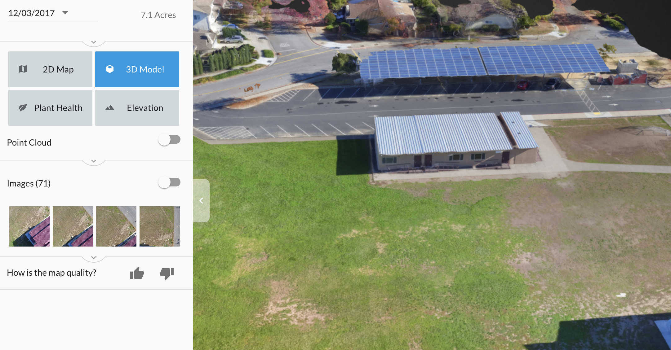 Our pilots are experienced flying the DroneDeploy and Pix4D applications. Ortho and 3D models can be produced covering the desired ground area. The images below were generated from a 71 image capture. The DroneDeploy UI is shown on the left side of the screen. Each map type has different options for distance, area, volume, and other data exports. Individual image files can be reviewed to evaluate the raw data input. Please use the Contact Us form to let us know your project requirements.